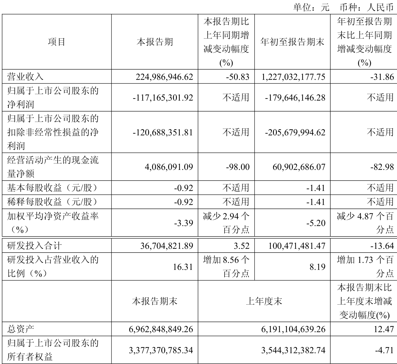 中证智能财讯中科微至(688211)10月31日披露2025年第三季度报告。前三季度公司实现营业总收入12.27亿元,同比下降31.86%;归母净利润亏损1.8亿元,上年同期亏损1189.16万元;扣非净利润亏损2.06亿元,上年同期亏损5720.31万元;经营活动产生的现金流量净额为6090.27万元,同比下降82.98%;报告期内,中科微至基本每股收益为-1.41元,加权平均净资产收益率为-5.20%。