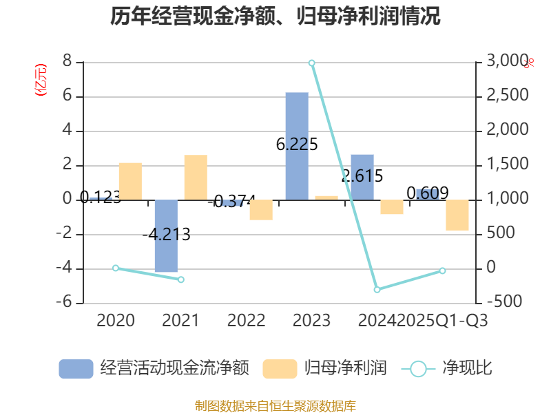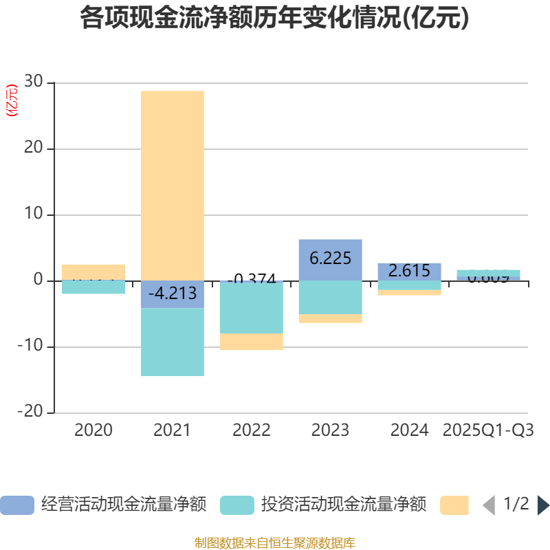 2025年前三季度,公司经营活动现金流净额为6090.27万元,同比下降82.98%;筹资活动现金流净额-347.63万元,同比增加8663.01万元;投资活动现金流净额9894.27万元,上年同期为-9594.61万元。