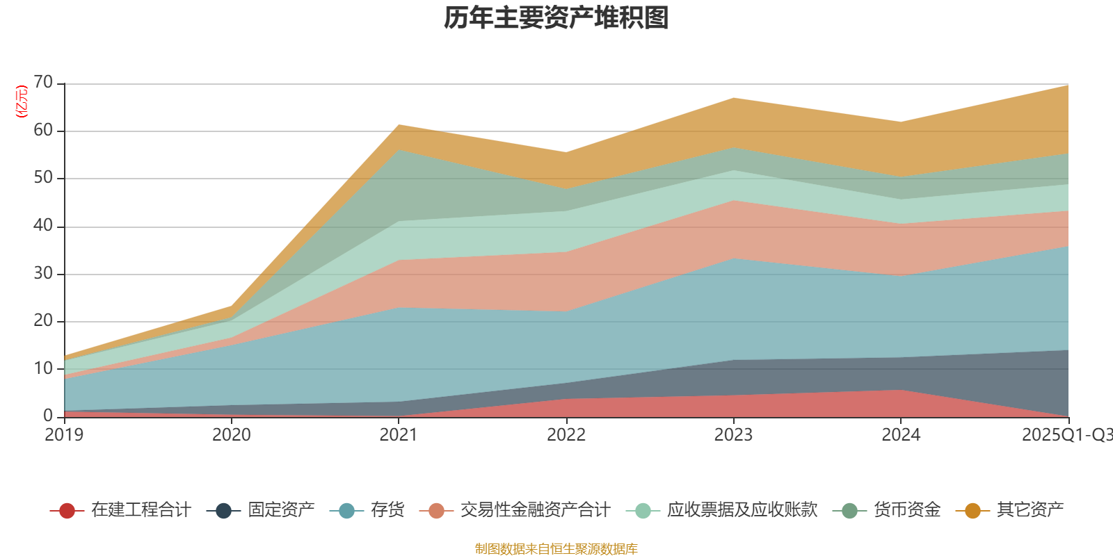 资产重大变化方面,截至2025年三季度末,公司在建工程合计较上年末减少98.22%,占公司总资产比重下降9.02个百分点;固定资产较上年末增加104.16%,占公司总资产比重上升8.99个百分点;交易性金融资产合计较上年末减少32.43%,占公司总资产比重下降7.1个百分点;存货较上年末增加27.99%,占公司总资产比重上升3.8个百分点。